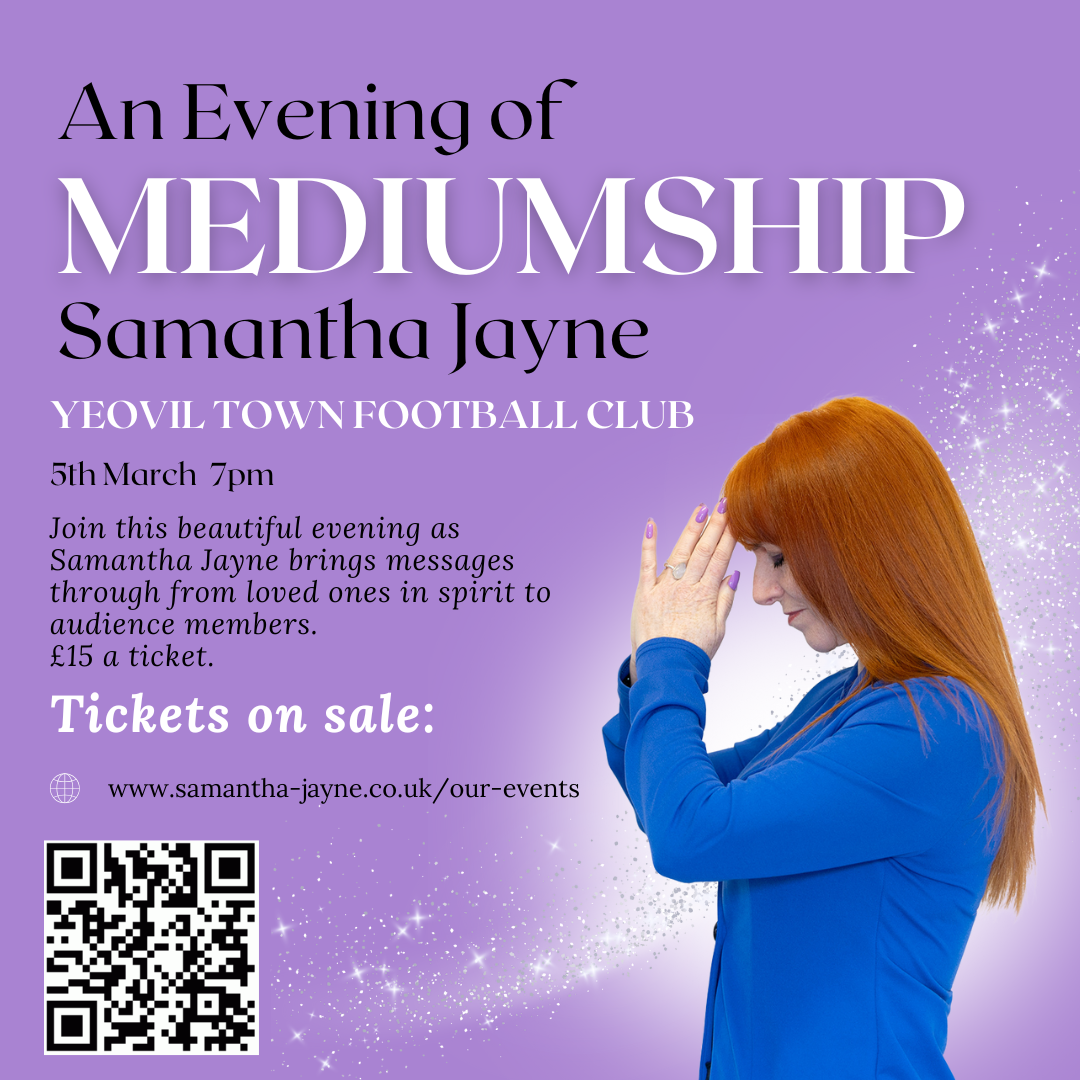 Join us at Huish Park for a peaceful and heartfelt evening as Samantha Jayne, a renowned spiritual medium, brings messages of love, comfort, and guidance from those in spirit.