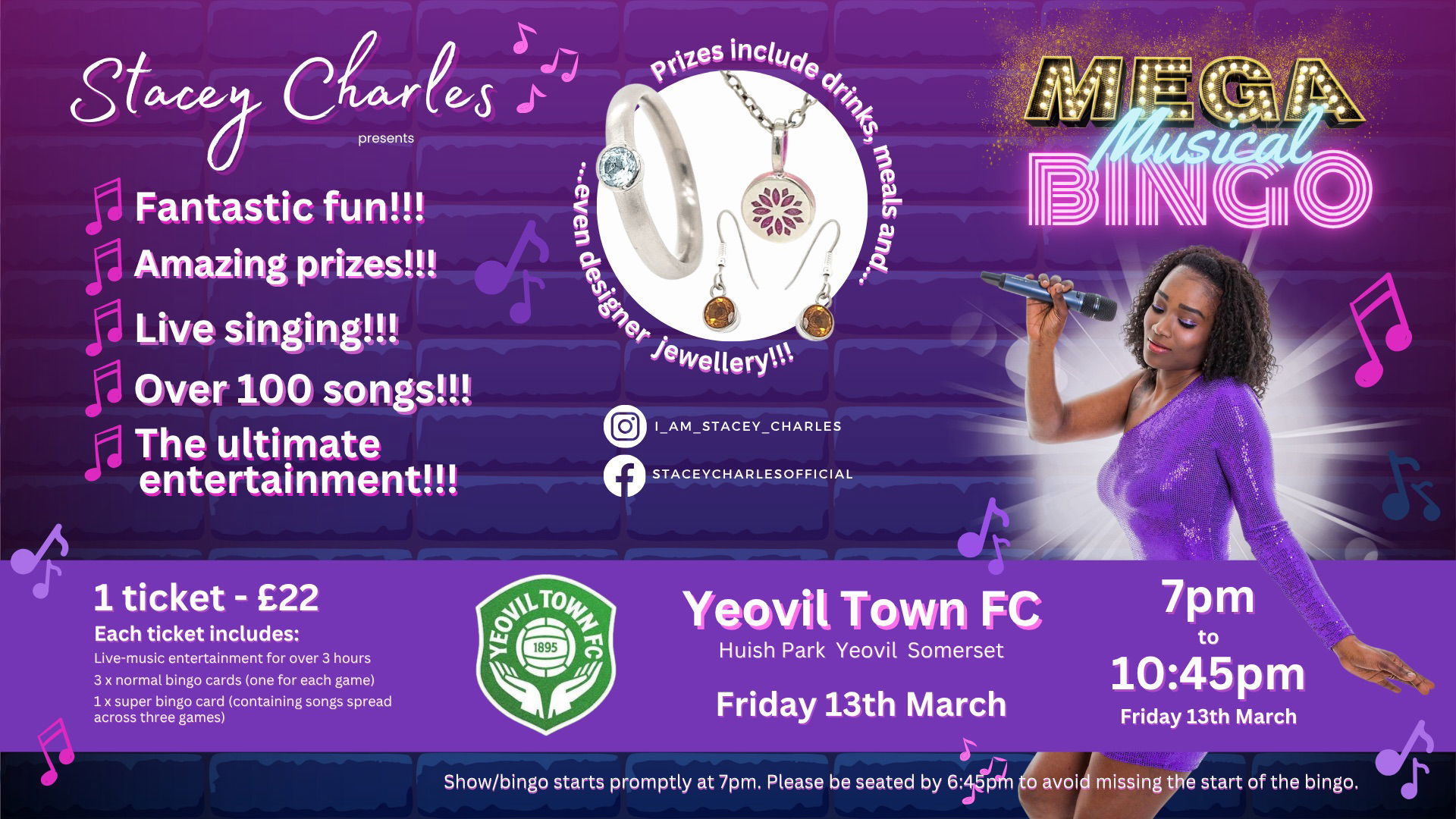 For one night only, join the incredible Stacey Charles – the sensational Caribbean performer – right here at Huish Park Stadium for three rounds of MEGA Musical Bingo!